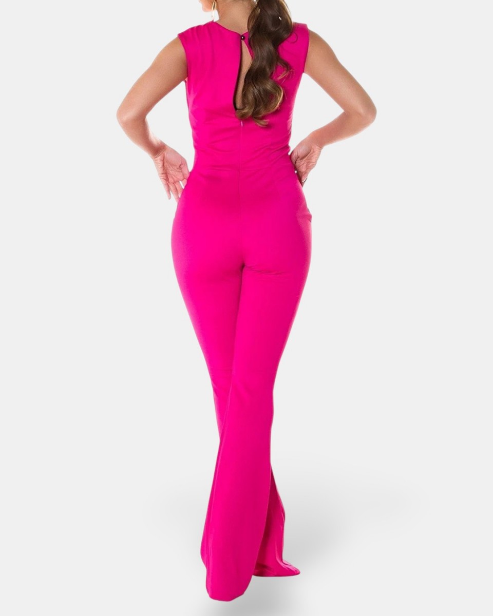 Elegáns, bő szárú, hosszú, pink női alkalmi overál, derekán fémes díszítéssel. Remek választás esküvőre, partyba, rendezvényre, különleges alkalomra.