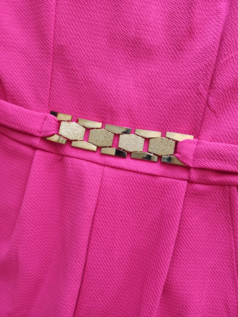 Pink színű, ujjatlan, bő szárú, alkalmi overál, melynek derekát, arany színű fém dísszel látták el a még elegánsabb hatás kedvéért. Kimondottan magasabb nőkre ajánlott (szárhossz miatt). A nadrágrész oldalában két oldalt zseb van, a fenekén nincs. A videó a régebbi típusról készült aminek még a fenekén zseb volt és övtartó a hátsó részen, az árult új fazonnál elől van csak. Stílusa remekül passzol egy komolyabb alkalomra is, akár színházba vagy esküvőre vendégként is remekül viselhető. Persze felvehetjük kiegészítőktől függően partyba vagy egy koncertre is. Kényelmes kialakításának köszönhetően nem kell feszélyezni magunk viselésekkor, több órán át is kellemes viselet.